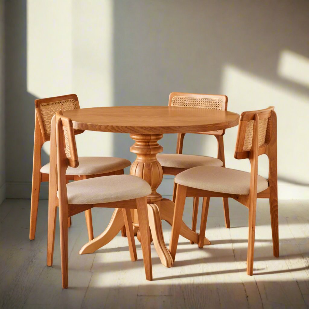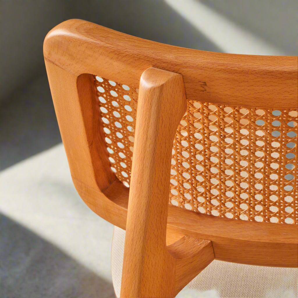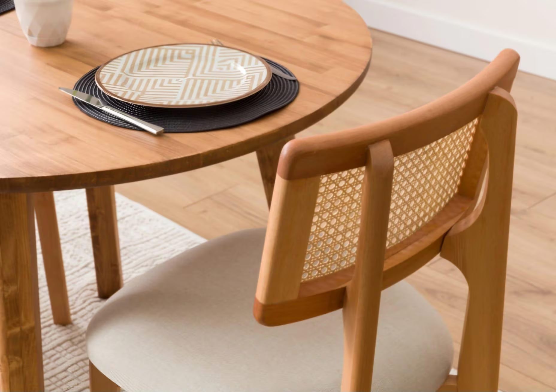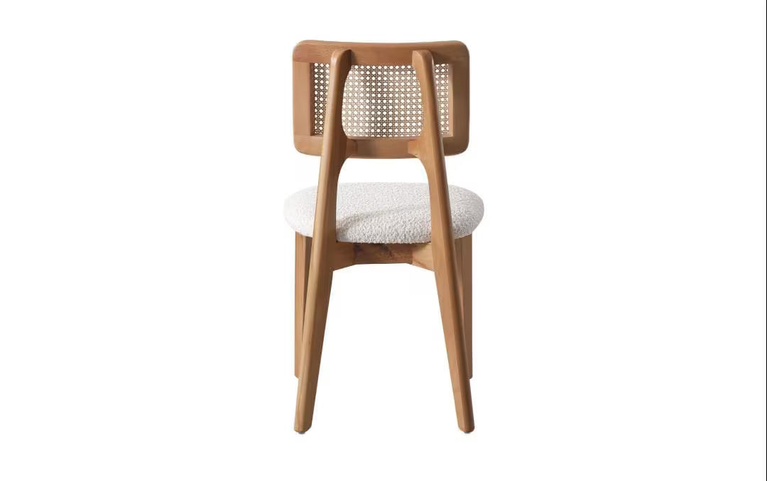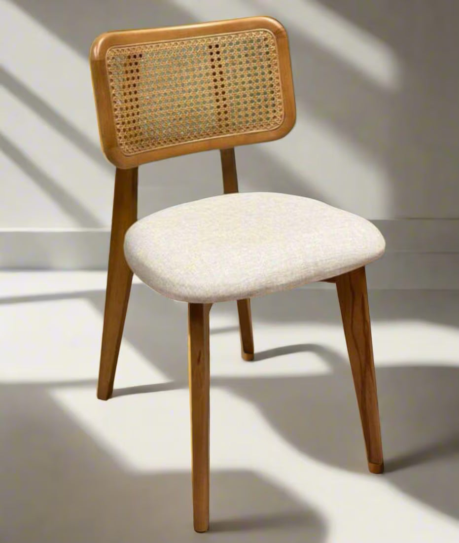 Hasır sırt tasarımı ve masif ahşap gövdesiyle öne çıkan bu sandalye hem estetik hem de dayanıklı yapısıyla dikkat çekiyor.