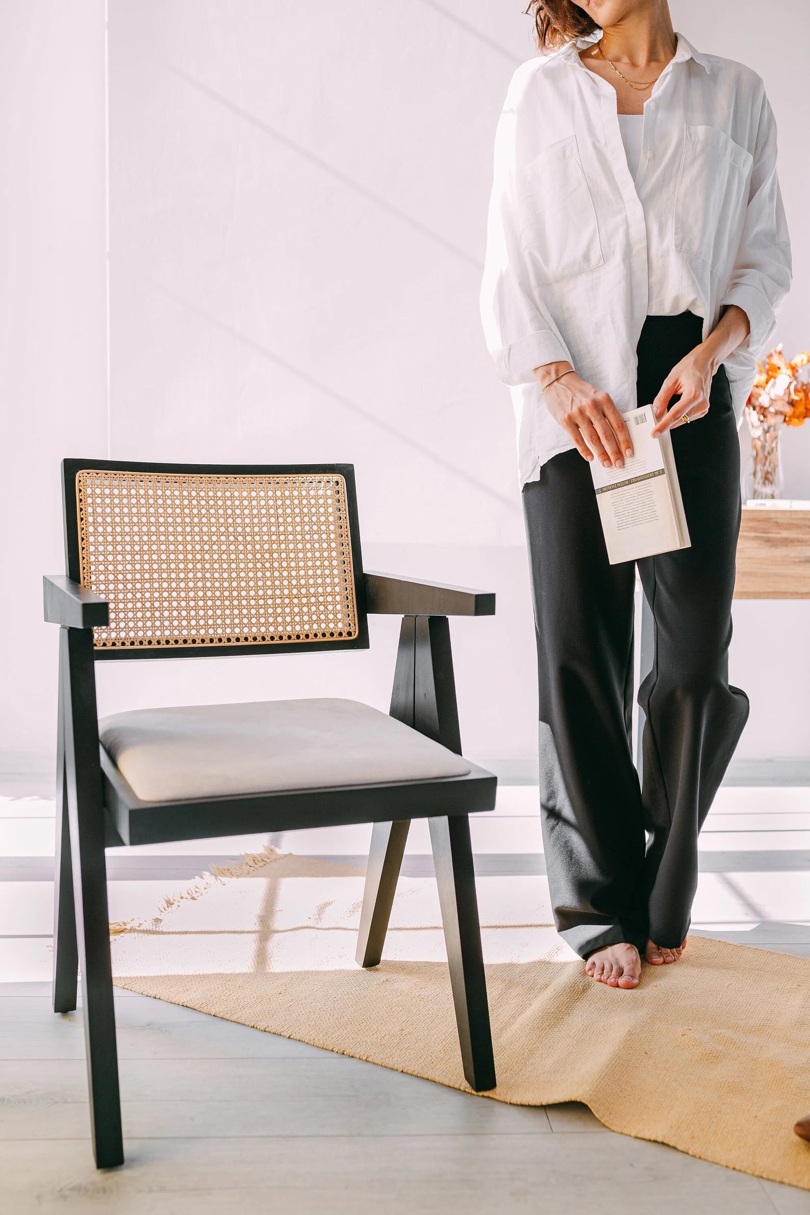 Modern bohemian tarzda Luna Pergel hazeranlı hasırlı ahşap sandalye. Doğal ahşap ve hasır detaylarıyla şık, dayanıklı ve konforlu. Premium kalite mobilya.