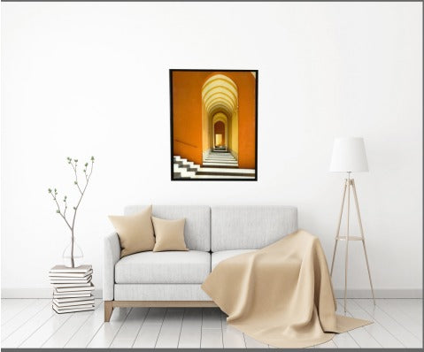 “Altın Geçit” tablosu, sıcak renklerin enerjisini minimalist bir mimari formla buluşturuyor. Kemerlerin ritmik dizilişi ve basamakların genişlemiş derinliği, tabloya hem modern hem de zamansız bir karakter kazandırıyor.