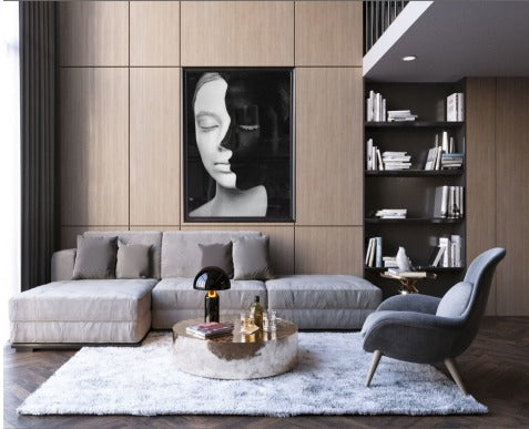 Minimalist dokunuşlarla hazırlanmış bu özel soyut yüz tasarımı, modern dekor anlayışına sanatsal bir zarafet katıyor. Siyah ve beyazın güçlü kontrastı sayesinde mekanda dikkat çekici bir odak noktası oluşur.
