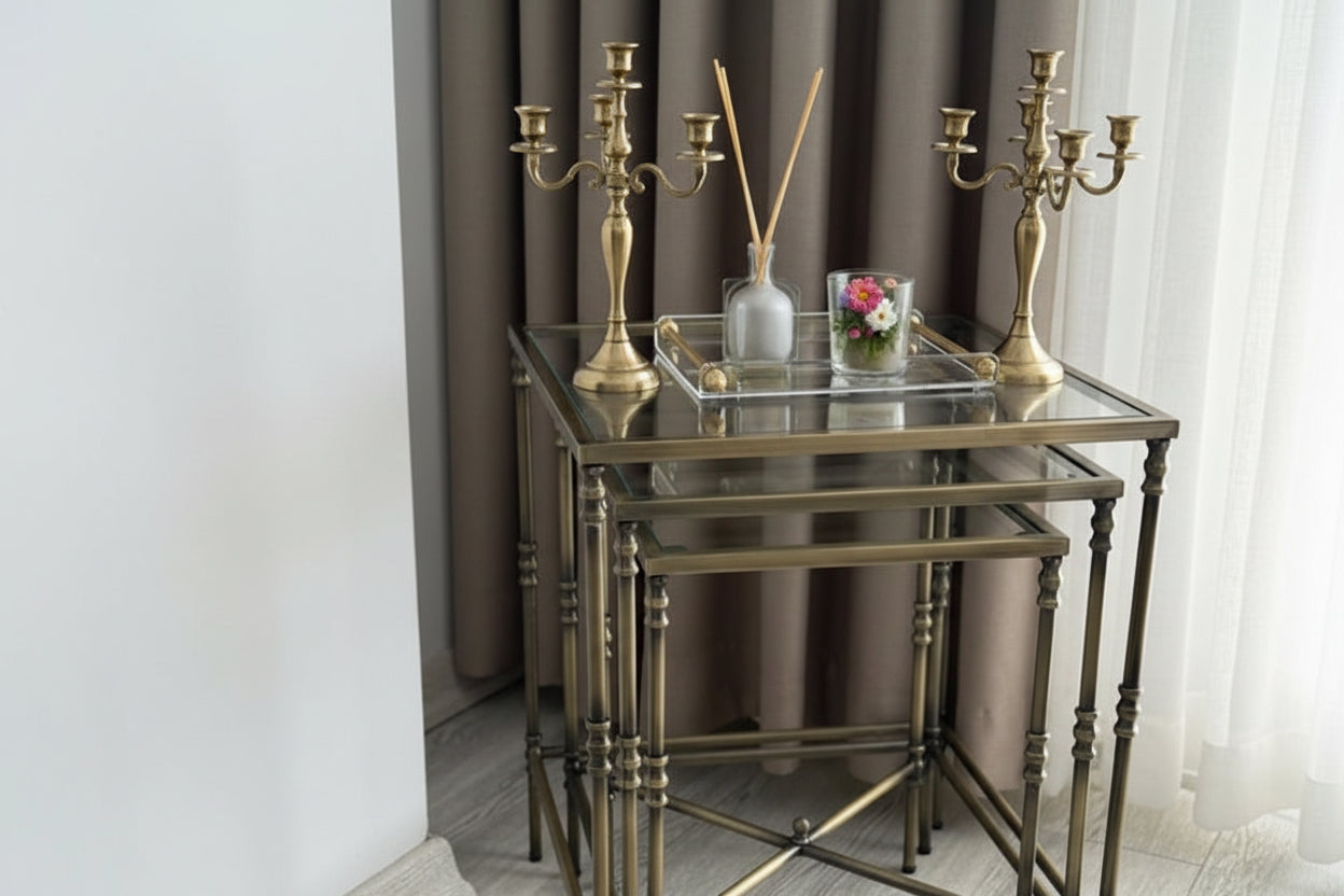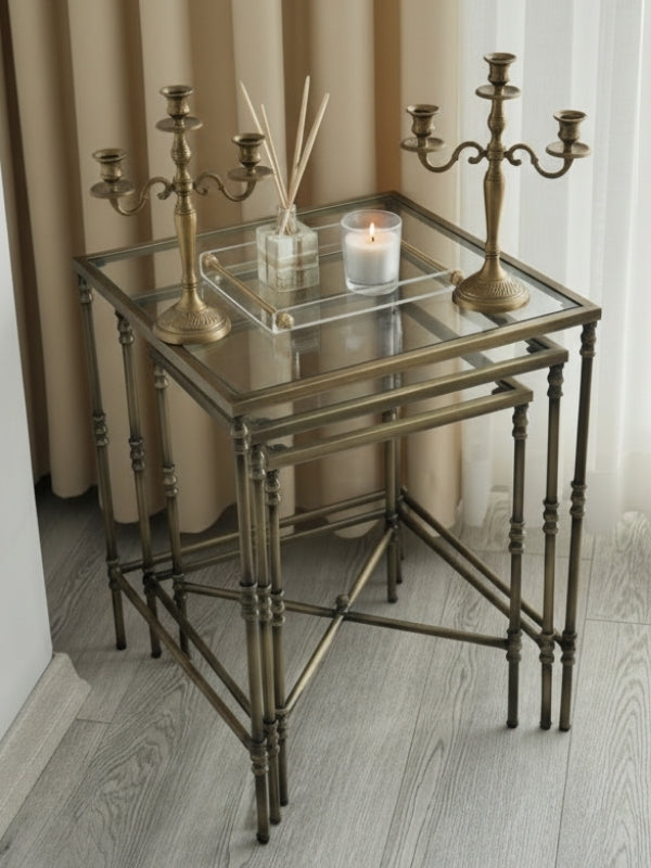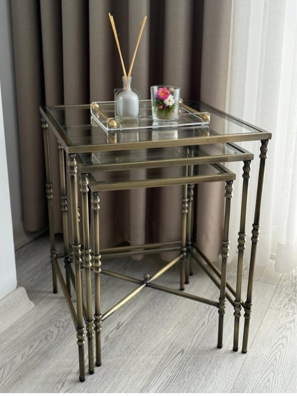 Torna Detaylı Pirinç Eskitme 3'lü Kare Zigon Sehpa Şeffaf Cam